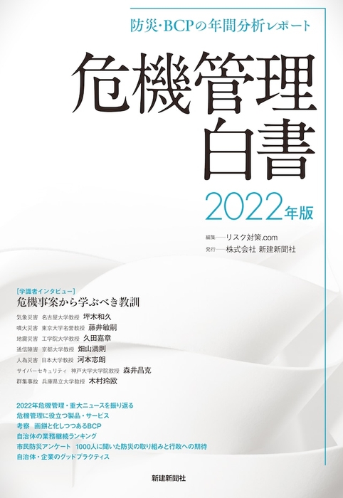 危機管理とBCPの専門メディアであるリスク対策.com(新建新聞社)は、2022年版の危機白書(本年創刊)の販売を開始しました。今年1年間に発生した危機事案についての学識者インタビューに加え、全国自治体の業務継続力ランキング、自治体・企業のグッドプラクティスなどを掲載。危機管理担当者やリスクマネジャー必読の内容となっています。BASEでの販売に加え、今後AMAZONでも販売をしていく予定です。