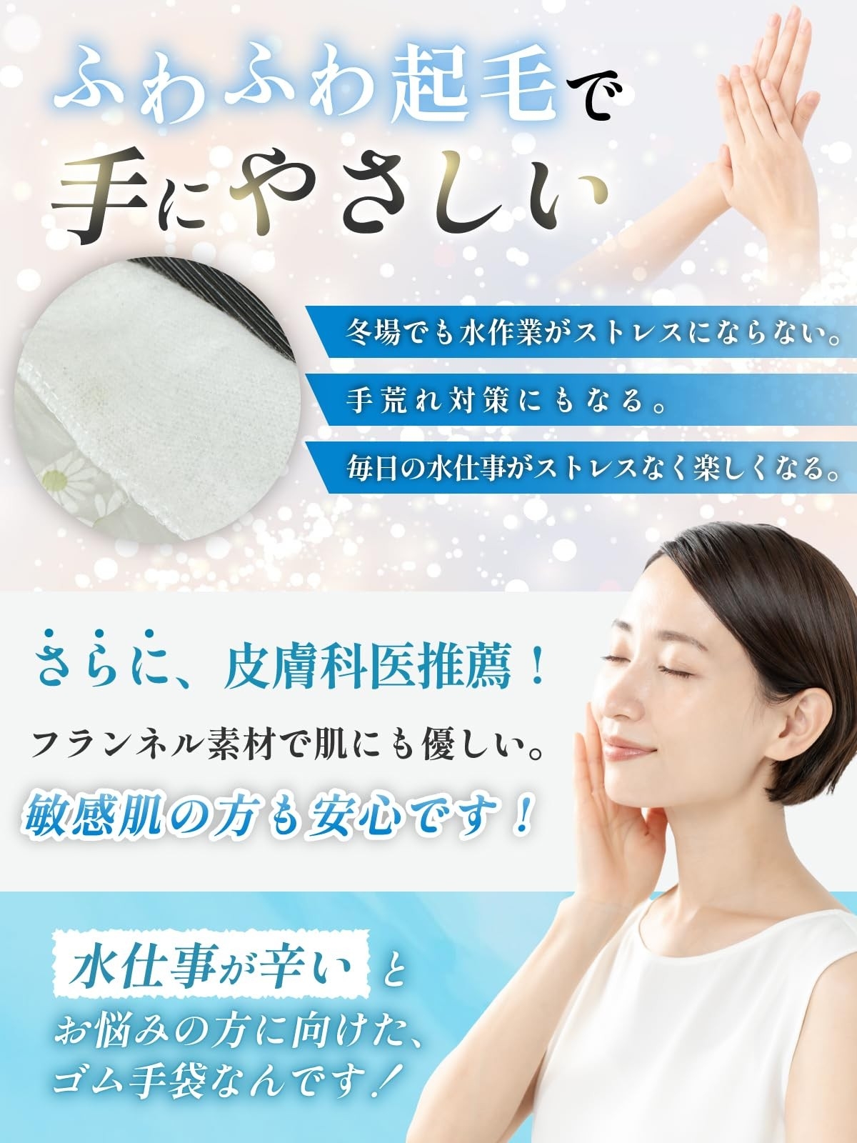 手肌の乾燥やベタつきを軽減し、寒い季節の水仕事でも快適に。
