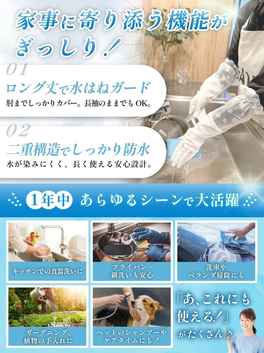 袖口のゴムが水の侵入やズレ落ちを防ぎ、食器洗い・掃除・洗濯など、