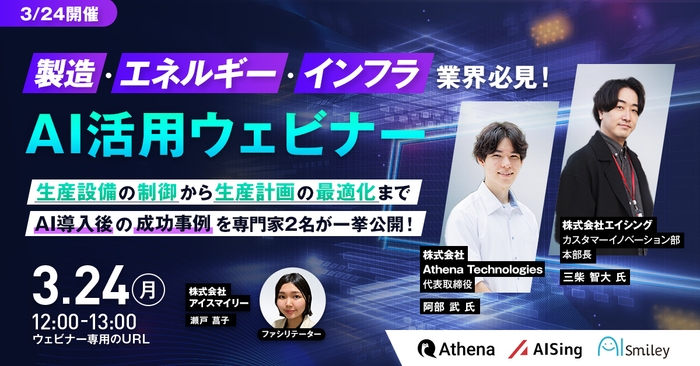 AIポータルメディア『AIsmiley』を運営する株式会社アイスマイリー(東京都渋谷区、代表取締役:板羽晃司)は、2025年3月24日(月)12時から「製造・エネルギー・インフラ業界向けAI活用法」をテーマにウェビナーを開催します。