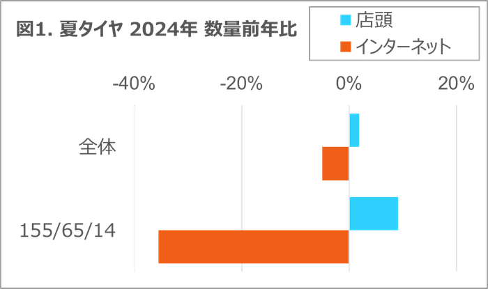 2024年のタイヤ販売は全体で数量前年比1%減と微減であった。夏タイヤは全体で数量前年比1%減で、店頭では同2%増となったものの、インターネットでは同5%減と前年を割り込んだ。店頭とインターネットで明暗が分かれた一因として、14インチのタイヤの販売が挙げられ、店頭では数量前年比が5%増加したことに対し、インターネットでは26%減少する結果となった。その中でも155/65/14の影響が大きく、店頭では数量前年比9%増、インターネットでは同36%減であった(図1)。この結果、155/65/14の数量構成比は店頭で23%(前年から+2%ポイント)、インターネットで9%(前年から-4%ポイント)となった。