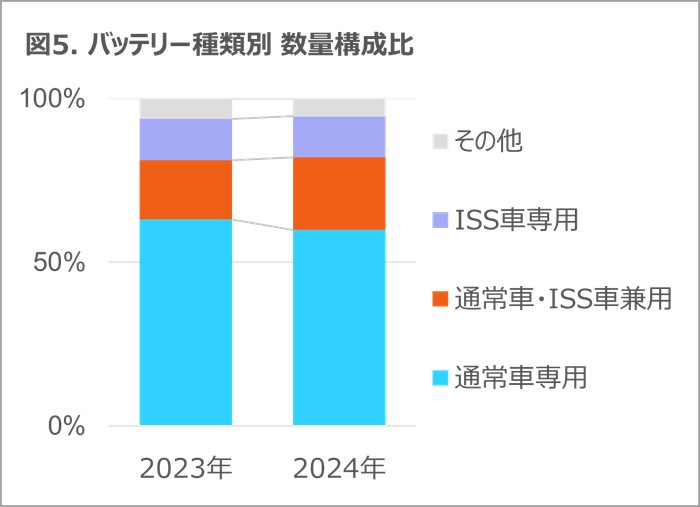 2024年の自動車用バッテリー販売は数量前年比10%増と前年を大幅に上回り、店頭では6%増、インターネットでは16%増に達した。規格別にみると、B20の数量前年比が店頭で20%増、インターネットで29%増であったが、最も販売の多いB19は店頭で4%減と前年を割り込んだ。バッテリーでは標準車・充電制御車(通常車)とアイドリングストップ車(ISS車)兼用が拡大傾向にあり、数量構成比22%と前年から4%ポイント増加した(図5)。その反面、通常車専用が数量構成比60%に縮小した。