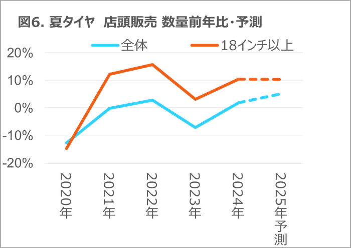 2025年のカー用品市場について、夏タイヤの数量前年比は店頭では5%増(図6)、インターネットでは1%増と予測する。18インチ以上は店頭で数量前年比10%増と、大型化のトレンドがさらに強まる見通しだ。エンジンオイルは、量り売りの増加の影響を受け4L缶の数量前年比は店頭で4%減と微減を見込む。バッテリーは店頭では数量前年比4%増、インターネットでは同11%増と前年を上回るものの、2024年からは成長率は鈍化すると見られる。