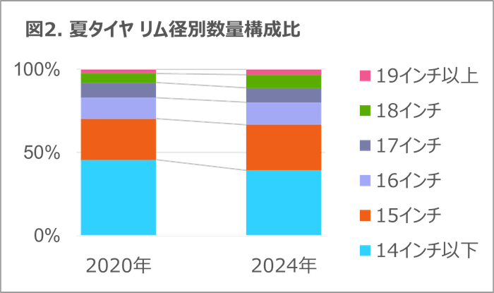 ・ タイヤ全体は数量前年比1%減と微減。15インチ以上の構成比が拡大しリム径の大型化の傾向が見られた。