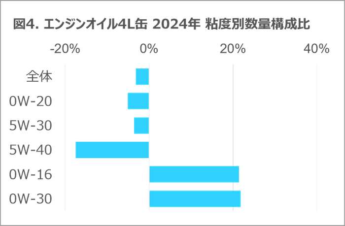 2024年、エンジンオイルの4L缶販売は数量前年比3%減と前年を下回り(図4)、店頭では同2%減、インターネットでは同14%減と落ち込みが大きかった。3L缶も数量前年比4%減と微減であった一方で、1L缶は同12%増と二桁成長を見せた。4L缶の主要な粘度では、0W-20が数量前年比5%減、5W-30が同4%減、5W-40が同18%減と減少した。そうした中ではあるが、0W-16は数量前年比21%増と0W-30は同22%増と二桁成長を遂げた。また、ベースオイル別にみると、鉱物油が数量前年比10%減、全合成油が同4%減であったことに対し、部分合成油は同3%増と前年を上回った。