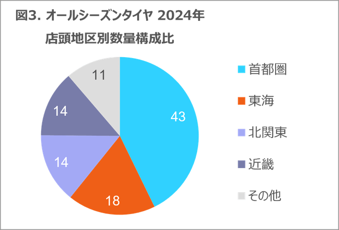 オールシーズンタイヤの2024年通年の数量前年比は全体で3%増と微増であったものの引き続き前年を上回って推移した。店頭では数量前年比29%増と著しい成長を遂げた一方で、インターネットでは同16%減と前年を割り込んだ。オールシーズンタイヤの店頭販売のうち43%を占める首都圏(図3)では数量前年比36%増と大幅な伸長を見せた。