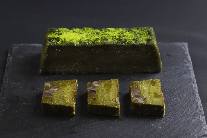 ナパージュ、チーズクリーム、ババロアの3層生地でつくるお濃茶ケーキ。