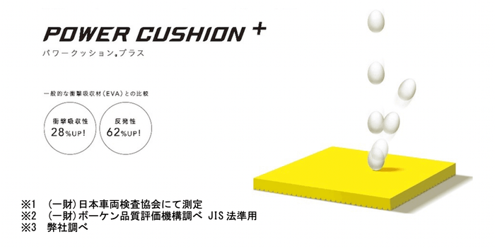 弊社独自の衝撃吸収性と反発性を併せ持つ衝撃吸収素材パワークッション。パワークッションに反発性の高い特殊樹脂を添加し、格子状に+型の溝を最適な間隔と深さで配置した新構造を採用した「パワークッション®プラス」は、従来の軽量性を保ちつつ、衝撃吸収性を28%※1、反発性を62%※2向上させ(一般的な衝撃吸収材[EVA]との比較)、12mの高さから落とした生卵が、割れずに6m以上跳ね返る※3新衝撃吸収反発素材です。