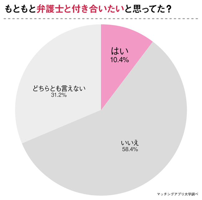 弁護士と付き合っていた女性に、「もともと弁護士と付き合いたいと思っていたか」について聞いてみました。「付き合いたいと思っていた」と回答した女性は10.4%と、あまり多くない結果になりました。