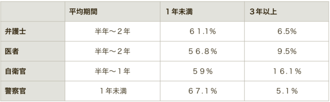 また、1年以内に破局した人の合計は61.1%、3年以上交際した人の合計は6.5%です。数字だけ見ると交際期間が短い印象を受けますが、次のように過去に調査した医者、警察官、自衛官との交際期間と比較してみると大きな差はないようです。