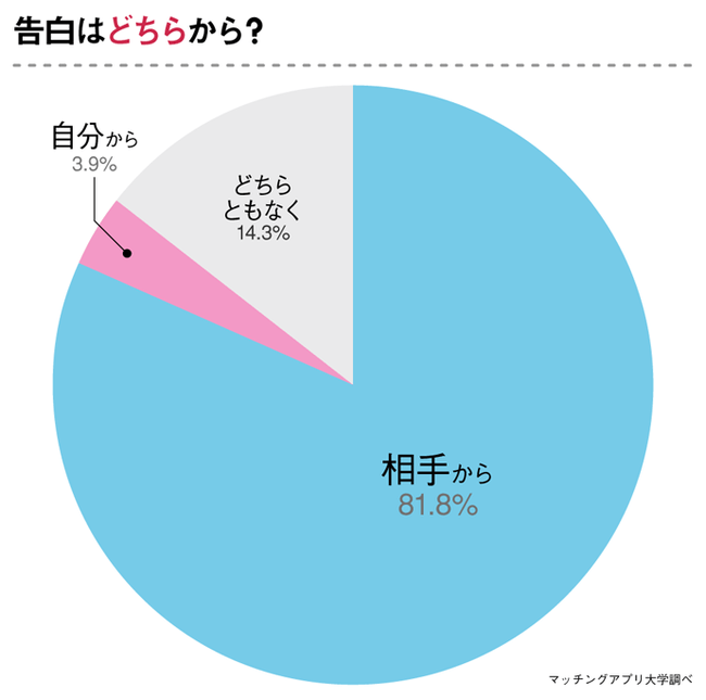 どちらから告白をしたか聞いたところ、「相手から(81.8%)」が8割以上を占め、「自分から」と回答したのは3.9%と少数でした。どんなシチュエーションでの告白だったのか、詳しく聞いてみました。