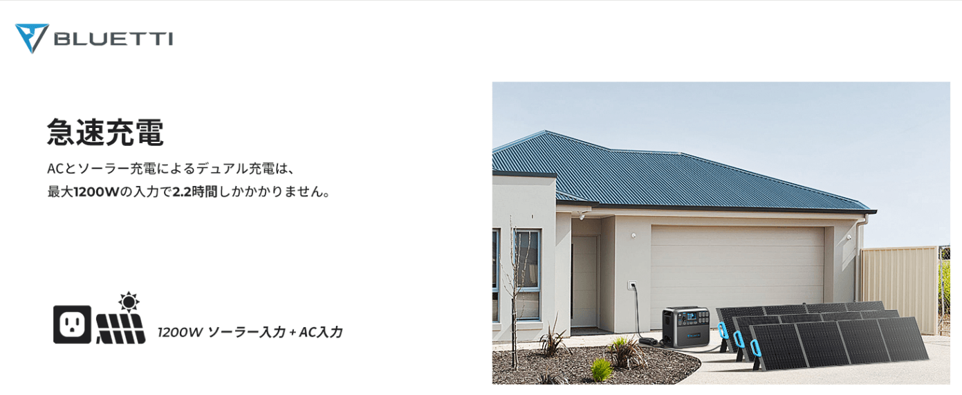 BLUETTIの主力モデルの1つであるAC200Pは、どこでも簡単に充電ができる、パワフルで価格の手頃な製品です。緊急時のバックアップ電源として、あるいは自給自足のオフグリッド生活に、どこでも充電が可能な太陽光発電キットをご活用いただけます。日照条件が良好な状態でPV200ソーラーパネルを3枚使用すれば600Wの発電ができ、AC200Pを3.5時間でフル充電できます。360Wの太陽光発電を実現するPV120キットもご用意しています。今すぐキャンペーンをご利用ください。