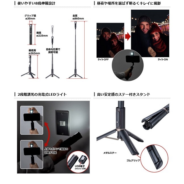 コンパクトサイズながら、3本の脚を広げるだけでしっかりと安定して自立するスタンド機能を備えています。メタルステー付きで強度も確保し、滑り止めグリップゴムでさらに安定性を向上。様々なシーンで安心して撮影できます。