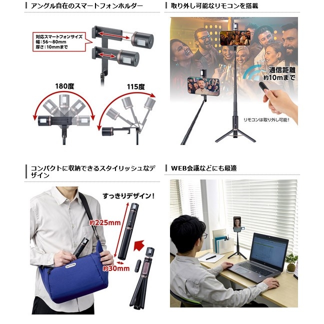 簡単操作でスマホ用スタンドにもセルフィースティックにもなる、便利な三脚付き自撮り棒。自撮りや動画撮影、集合写真、ライブ配信など、これ一本で様々なシーンに対応できます。