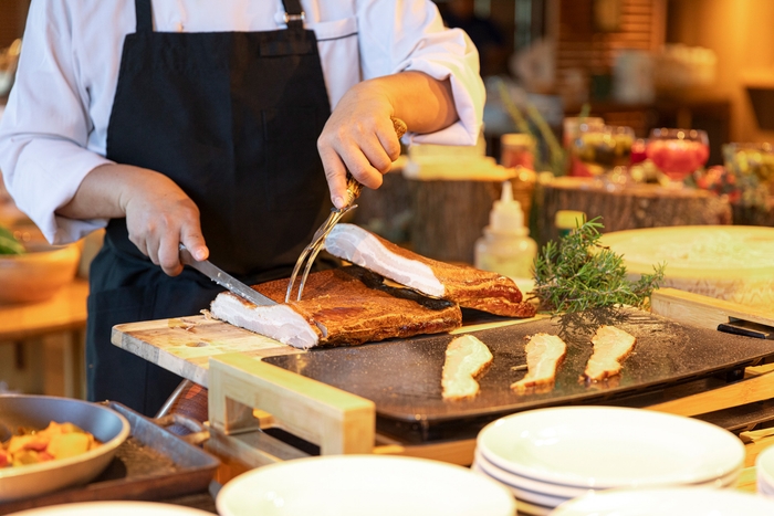 翌朝は、広がるガーデンを望む「舞洲キッチン」にて、地元産の新鮮な野菜やハーブを活かした朝食をお楽しみいただけます。ライブキッチンでは、シェフが焼きたての自家製燻製ベーコンやフレンチトーストをその場で仕上げ、目でも舌でも楽しめる贅沢なひとときを演出します。