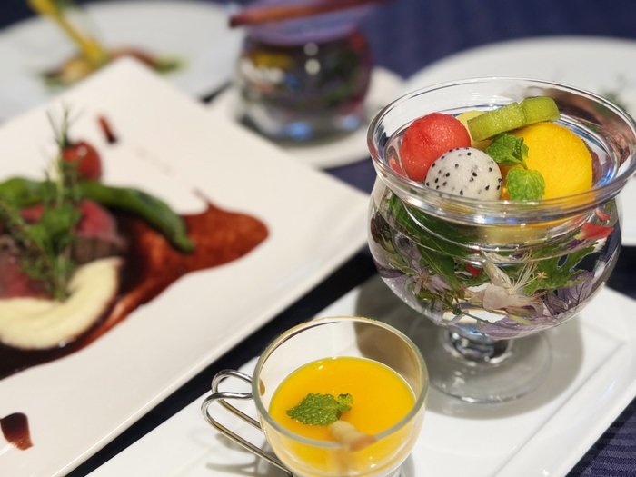 料理長が厳選した関西の旬の食材を贅沢に取り入れ、一皿ごとに彩り豊かなディナーコースをご用意しました。前菜には、生ハムを練りこんだグリッシーニや湯葉とサーモンのカルパッチョが登場し、華やかな食事の幕開けを演出します。