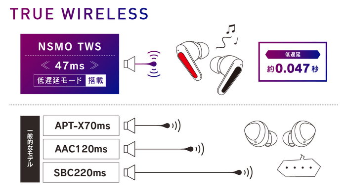 Bluetoothの接続時では、通常AAC接続でもおよそ120ms、APT-Xで70msと遅延が発生するのですが、NSMO TWSではコーデックの種類に関係なくSBCでもAAC接続でも低遅延を実現! iPhoneでもアンドロイド端末でも低遅延のゲームモードが使用可能です。