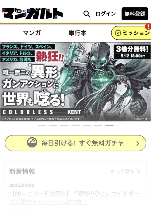 用意された様々な「ミッション」をクリアすることで、対象のマンガを1話分すぐに無料で読める「すぐ無料チケット」が手に入ります。楽しみながらミッションをこなすことで、よりお得にマンガライフを満喫できます。毎日チャレンジできる「すぐ無料ガチャ」も搭載