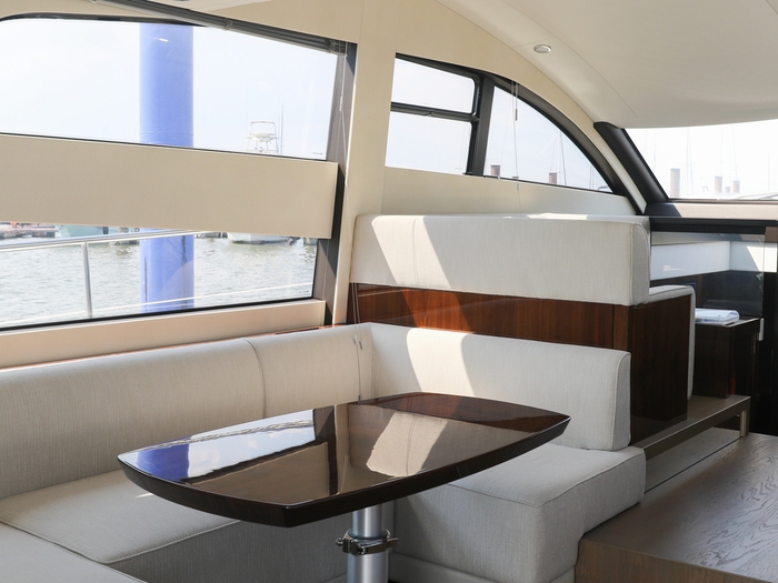 ラグジュアリークルーザー「スコードロン50」。 全長15mを超える船体は広々としたサロンとフライブリッジを備え、まるで海上のラウンジのような快適さを実現しています。 落ち着いたインテリアに包まれながら、ゆったりと花火を鑑賞できる贅沢なひとときを。