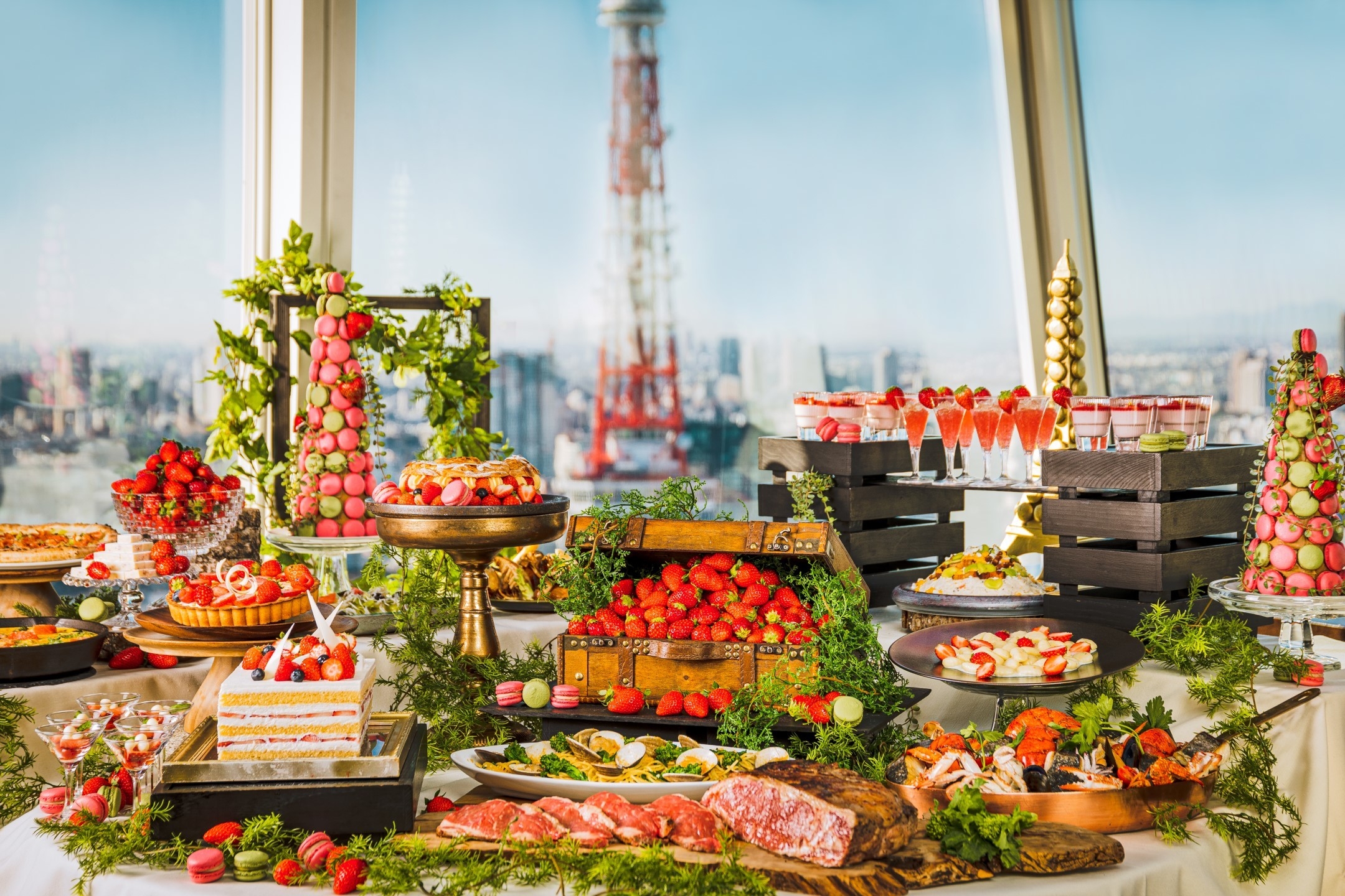 ビルの最上階からの絶景と色鮮やかなブッフェを同時に愉しめるのはXEX ATAGO GREEN HILLSだからこそ。春野菜をふんだんに使用した見た目も華やかなイタリアンブッフェの数々がずらっと並び、食欲をそそります。
