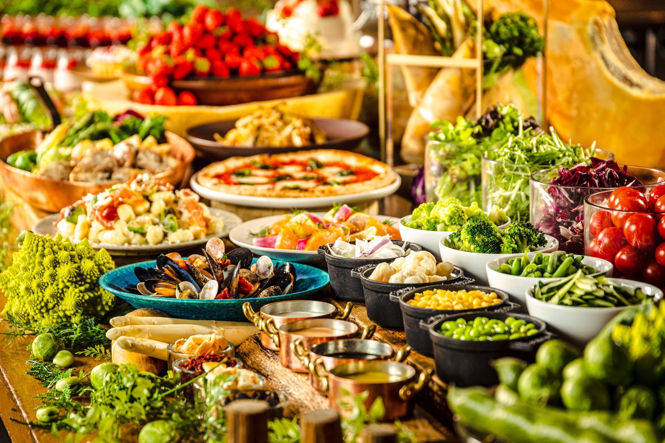 広々とした自慢のオープンキッチンにずらっと並ぶ華やかなブッフェの数々は目でも愉しませてくれます。香りと食感が特徴でシェフのイチオシ「厳選豚と春野菜のフリカッセ」や、大人気のリゾットには「たっぷり春野菜と削りたてグラナパダーノで和えた濃厚リゾット」が登場。