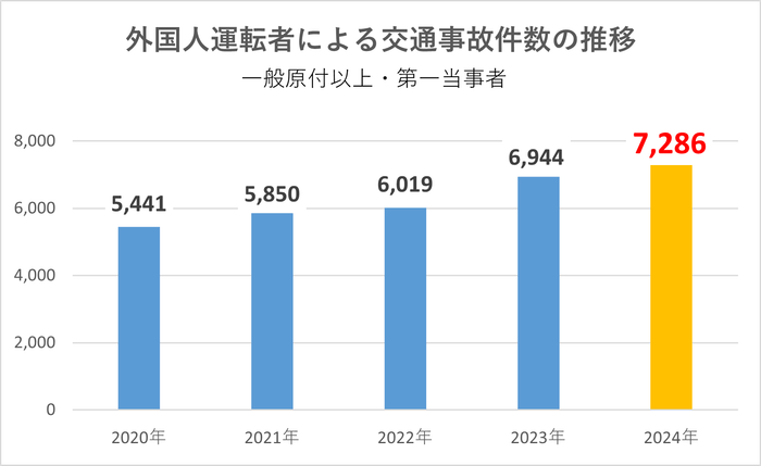 日本の運転免許証を保有する外国人が昨年末時点で過去最多の約125万人となっていることを背景に、事故件数も令和2年の5,441件に対し6年は7,286件と増加傾向にあります。