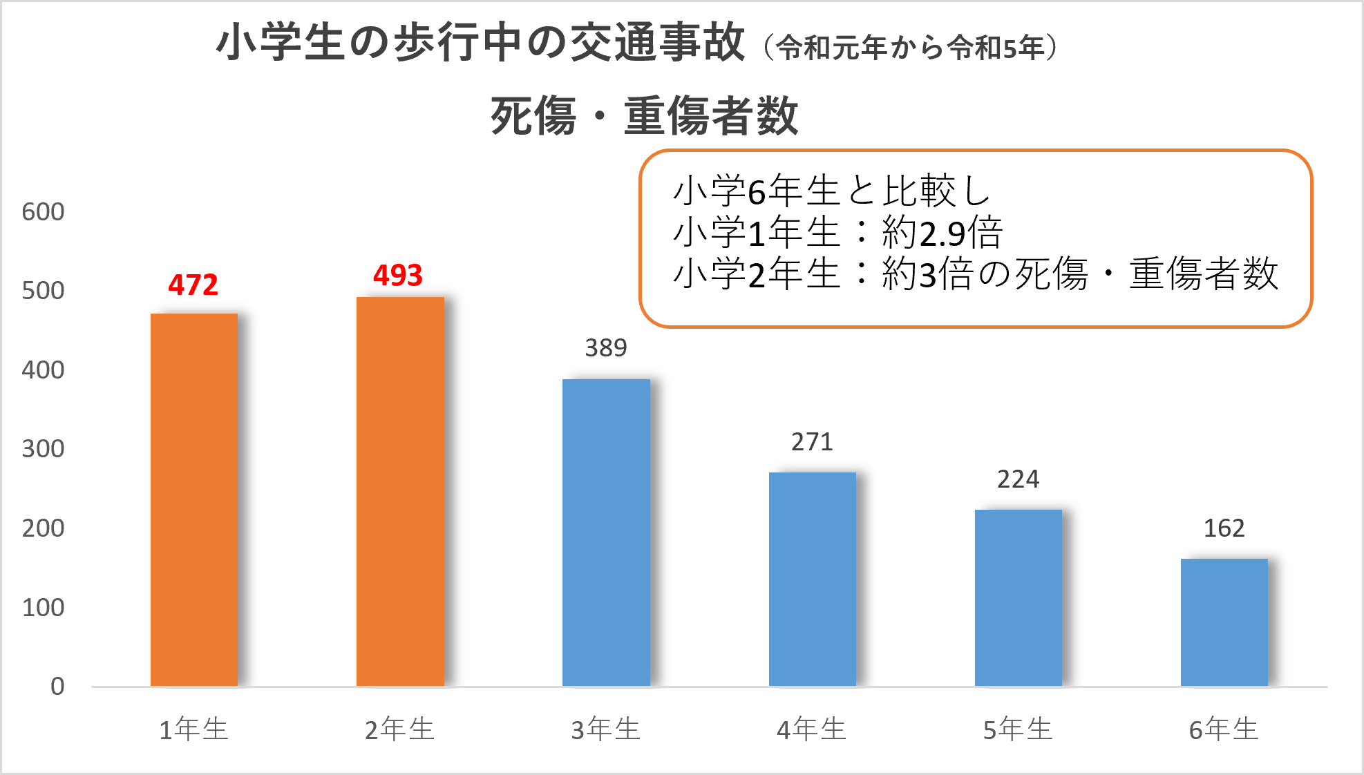 小学6年生と比較すると、小学1年生の歩行中死者・重傷者数は約2.9倍、小学2年生は約3倍と、低学年の子どもが占める割合が高いことが伺えます。
