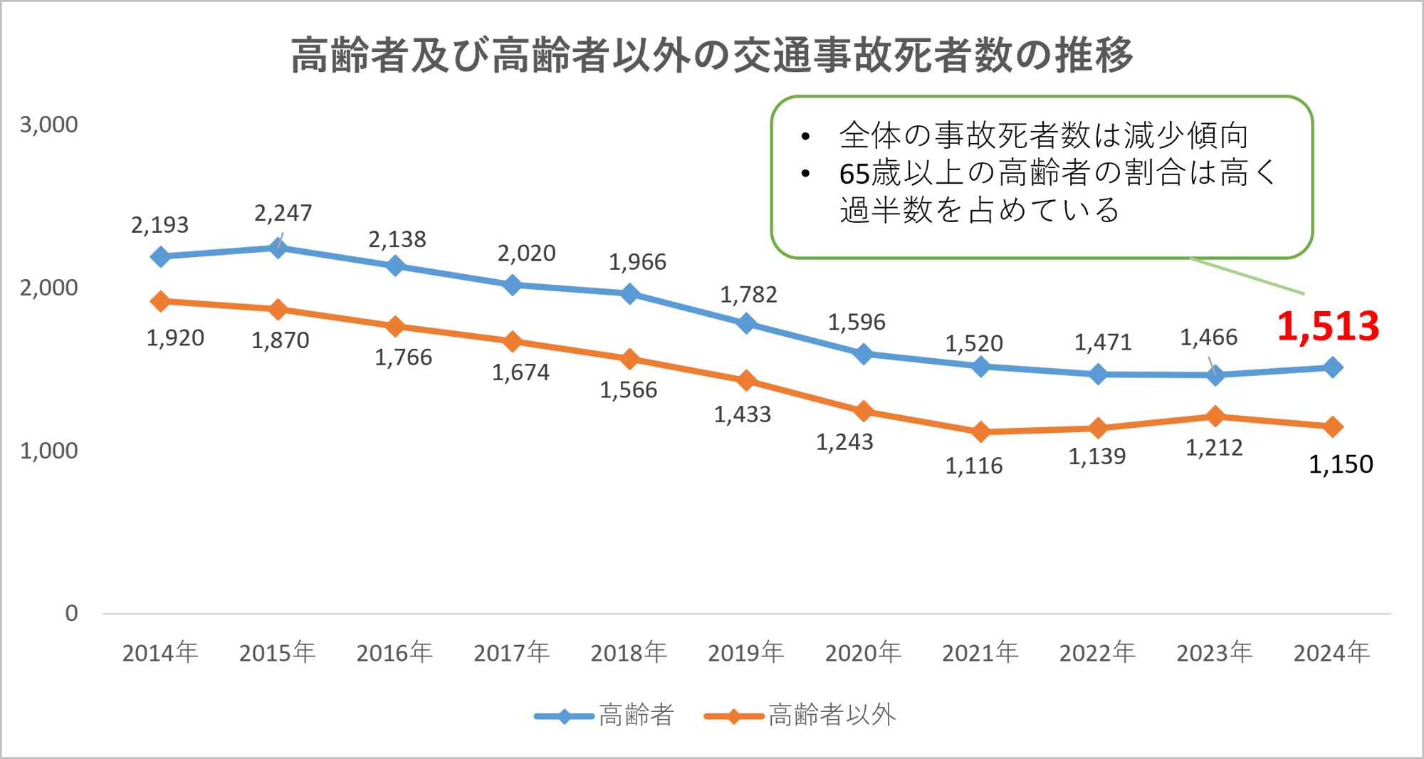 しかし、高齢者(65歳以上)が占める割合は高く、2024年の交通事故死者2,663人のうち1,513人(56.8%)と半数以上となっています。
