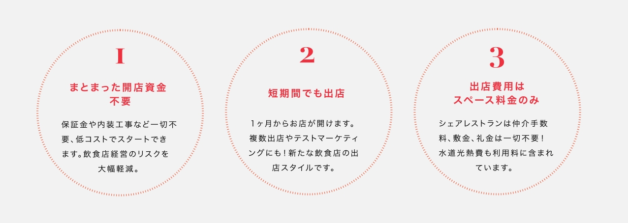 まずは、間借りでコツコツとファンを掴みませんか?ファンがいれば、借金も怖くはありません。 これから飲食店をはじめたい開業希望者は、「シェアレストラン」で月額定額で間借りすることができ、投資をせずに低リスクで飲食店を開業することができます。本サービスは、飲食店を通じ「低リスクで飲食店を開業したい利用者様」と「新しい仲間の募集に取り組みたいオーナー様」とをマッチングするプラットフォームです。