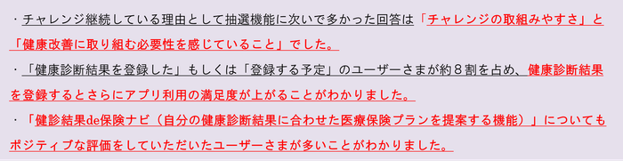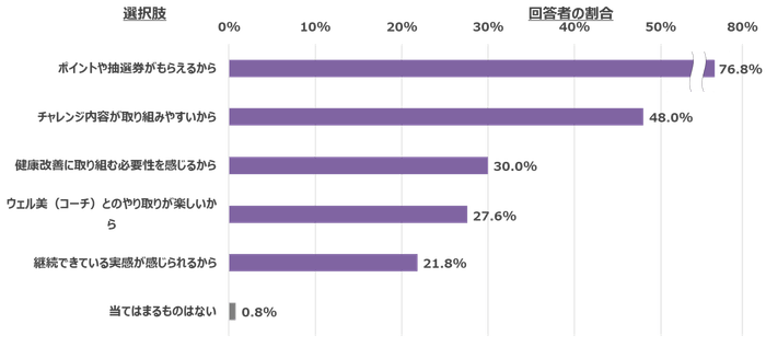 チャレンジ継続している理由として抽選機能に次いで多かった回答は「チャレンジの取組みやすさ」と「健康改善に取り組む必要性を感じていること」でした。