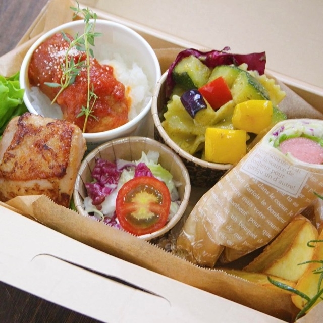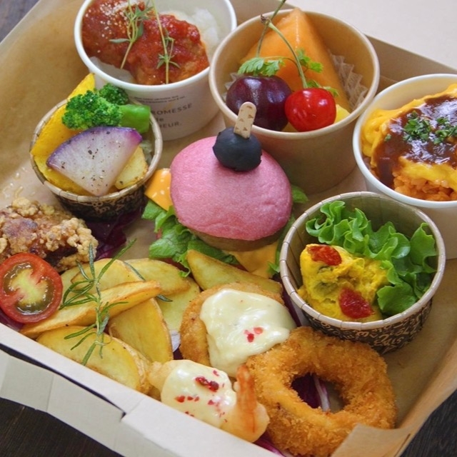 カラフルで華やかな料理空間作りが得意なシェフならではの料理を一人分ずつボックスに詰めました。