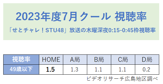 広島ホームテレビ「せとチャレ!STU48」2023年度上期・7月クール・9月月間視聴率で49歳以下 同時間帯1位を獲得!