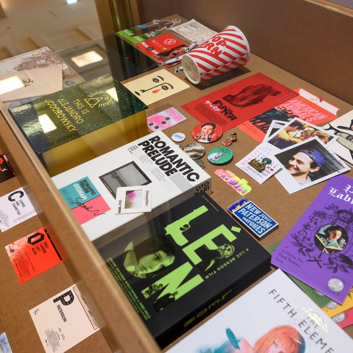 グラフィックデザイナーの大島依提亜氏がこれまでに手掛けてきた映画ポスターやパンフレット、関連グッズなど190点を展示。