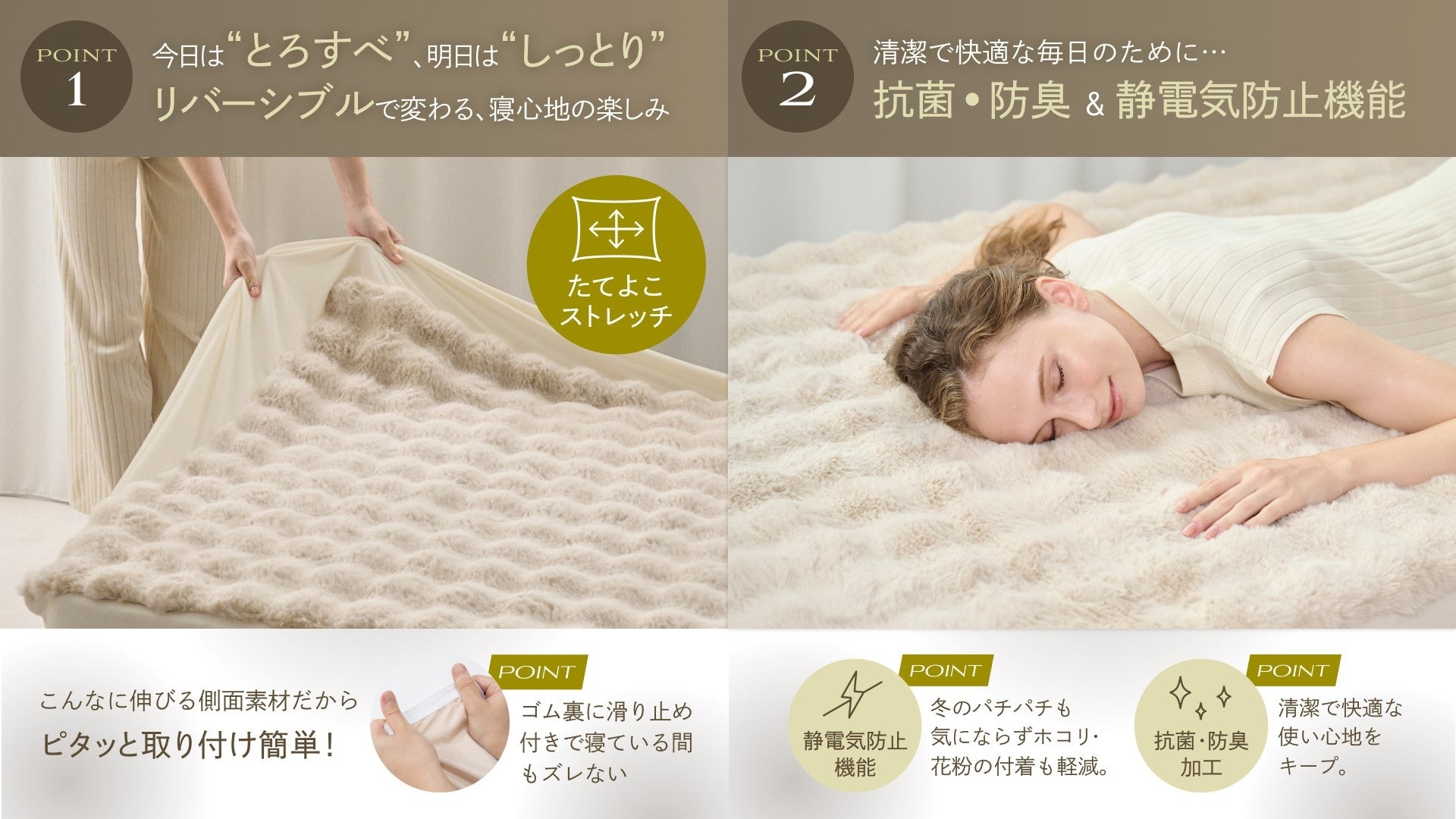 眠るたび、とろける贅沢。高密度ふわもこ素材を贅沢に使ったボックスシーツが新登場。まるで包まれるような極上の肌ざわりで、布団に入った瞬間からぬくもりに満たされます。側面ストレッチ素材でぴったりフィットし、付け替えラクラク。もちろん、ご家庭で丸洗いできて、いつでも清潔に保てます。寝室の印象を一気にアップさせる上質な見た目も魅力。忙しい毎日に心地よさをプラスする「とろけるシーツ」です。