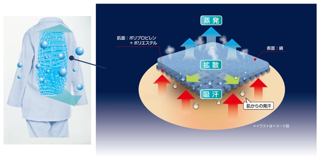 上衣の背中部分を2層構造のドライメッシュにすることで、汗をすばやく吸収、拡散、蒸発させるのでさらっと快適
