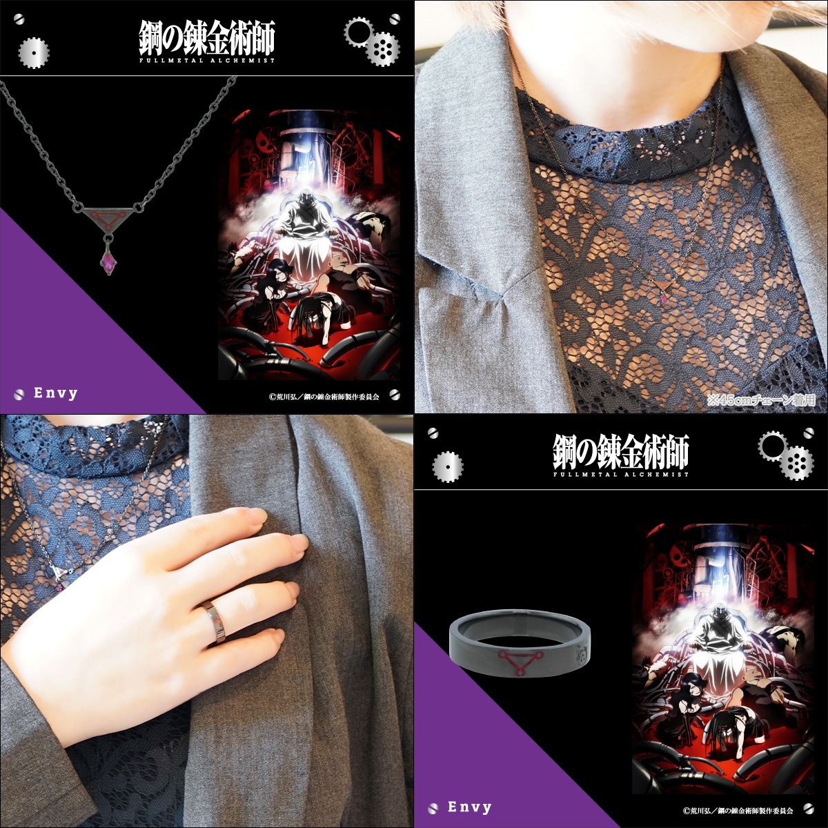 エドワード・エルリック、アルフォンス・エルリック、ウィンリィ・ロックベル、ロイ・マスタング、エンヴィー、リン・ヤオの総勢6名のキャラクターの他、ウロボロスモチーフもラインナップ。キャラクターのイメージモチーフやマーク、イメージカラー等を贅沢に盛り込んだデザインのアクセサリーはファン必見のプレミアムアイテムになっています。