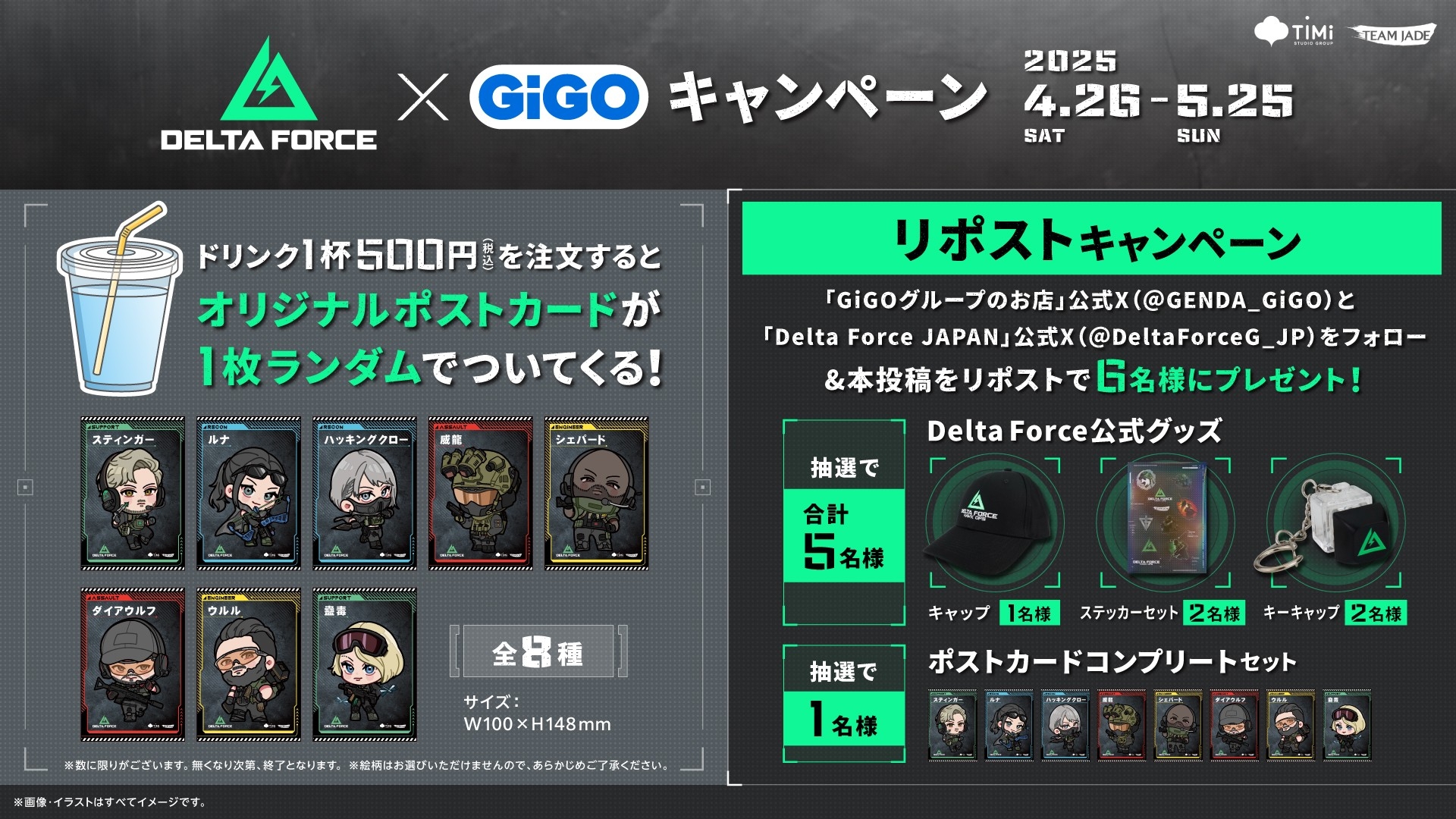 キャンペーンの開催を記念してXにてフォロー&リポストキャンペーンを実施いたします。『GiGOグループのお店 公式アカウント( https://x.com/GENDA_GiGO )』と『Delta Force Game Japanアカウント( https://x.com/DeltaForceG_JP )』をフォローの上で、該当の投稿をリポストされたお客さまの中から抽選で合計6名の方にDelta Force公式グッズなどを進呈いたします。