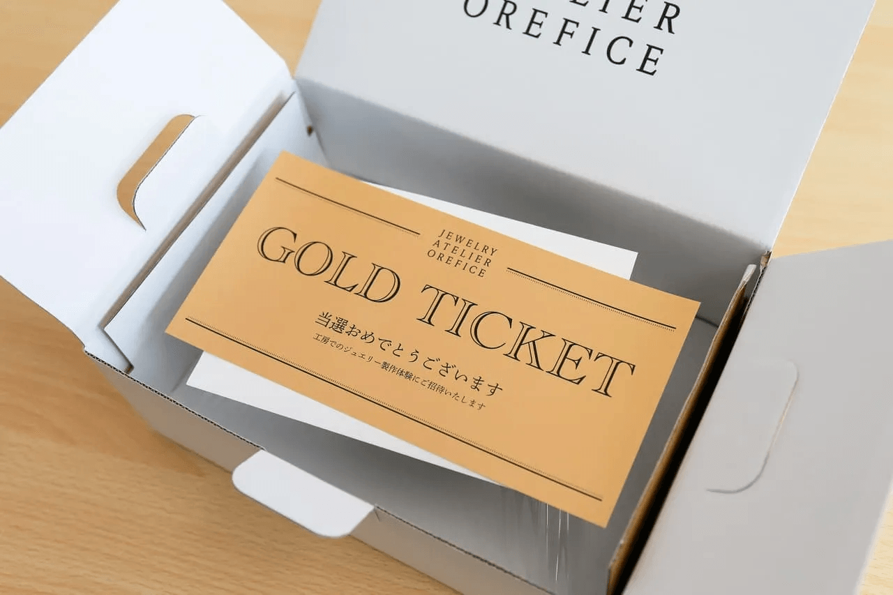 当選された方のお届け品の中には、ゴールドのチケット(工房ご招待券)が封入されています。