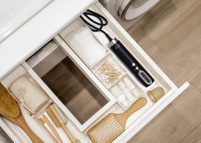 パッと見ドライヤーには見えないストームスティックは本体サイズ幅4.3cm、奥行4.9cm、高さ23.3cmとコンパクト設計で、ごちゃごちゃしやすい洗面台収納をスマートにします。