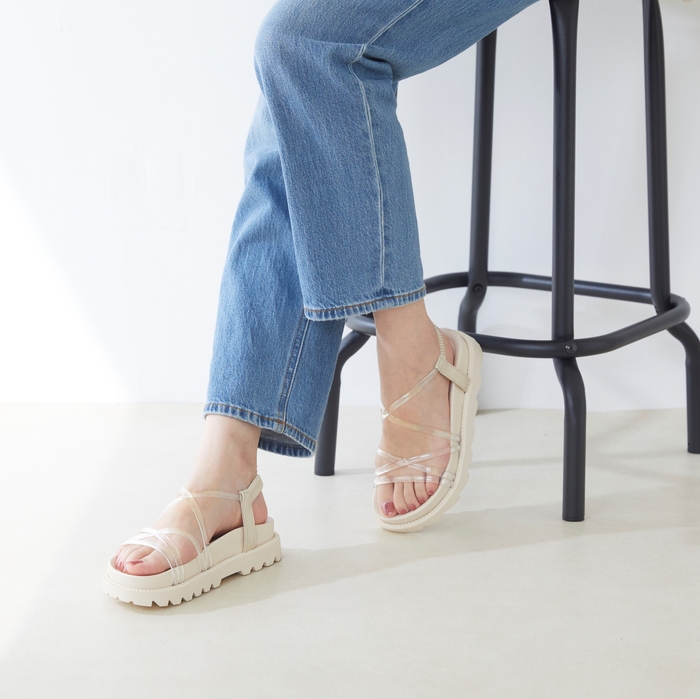 ボリュームたっぷりの厚底サンダルは、幅広コバ+二重の厚底でオシャレにアップデート。