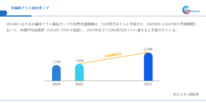 QYResearchが発表した新たな市場調査レポート「半導体ドライ真空ポンプ―グローバル市場シェアとランキング、全体の売上と需要予測、2025~2031」によると、世界の半導体ドライ真空ポンプ市場規模は2024年の約1330百万米ドルから2025年の1436百万米ドルへと順調に拡大すると見込まれ、予測期間中は年平均成長率(CAGR)8.8%で成長し、2031年には2384百万米ドルに達すると予測されている。