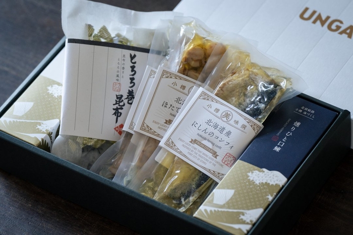 かつて北前船が北海道から上方へ運んだのが昆布、鰊、鮭などの海産物。ここ小樽からも沢山の海の幸が運ばれました。北前船が運んだ海の幸小樽百貨UNGA↑オリジナルシリーズ「北海美味撰」より、人気の品々を詰め合わせました。豊かな北海道の海の幸を、北前船の往来で開けた小樽の歴史とともにUNGA↑オリジナルパッケージに込めてお届けします。