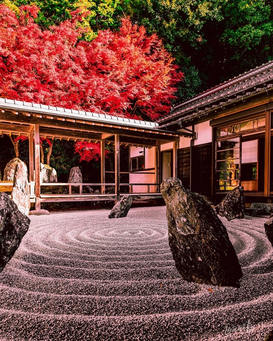 枯山水の庭園を低いアングルから撮ることで、岩の壮大な印象からの背景に映り込む渡り廊下や紅葉の視線誘導も素敵です。