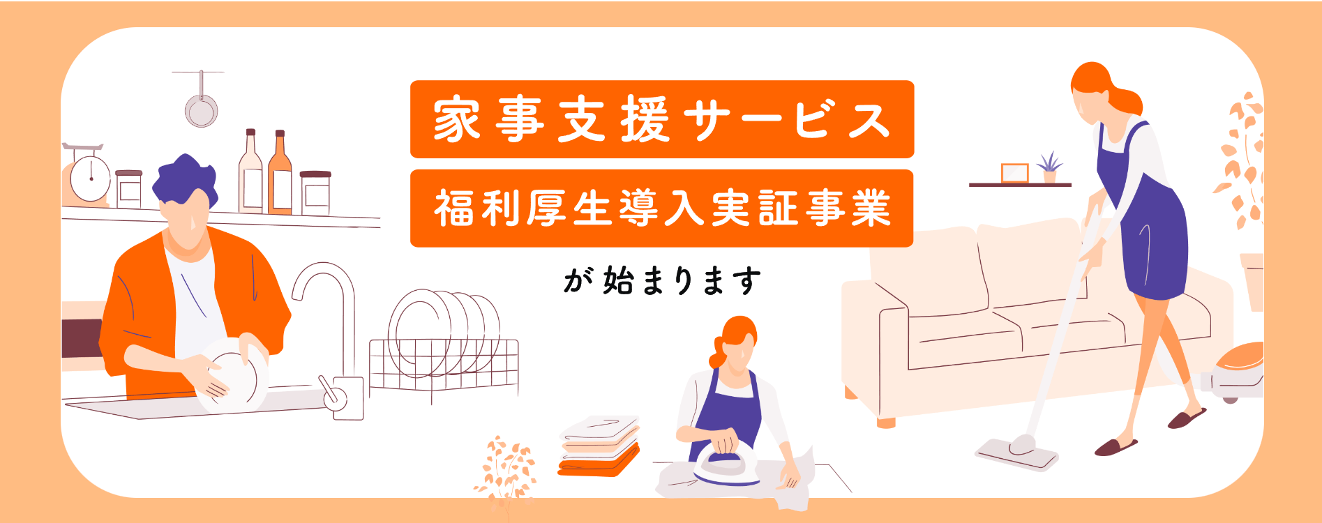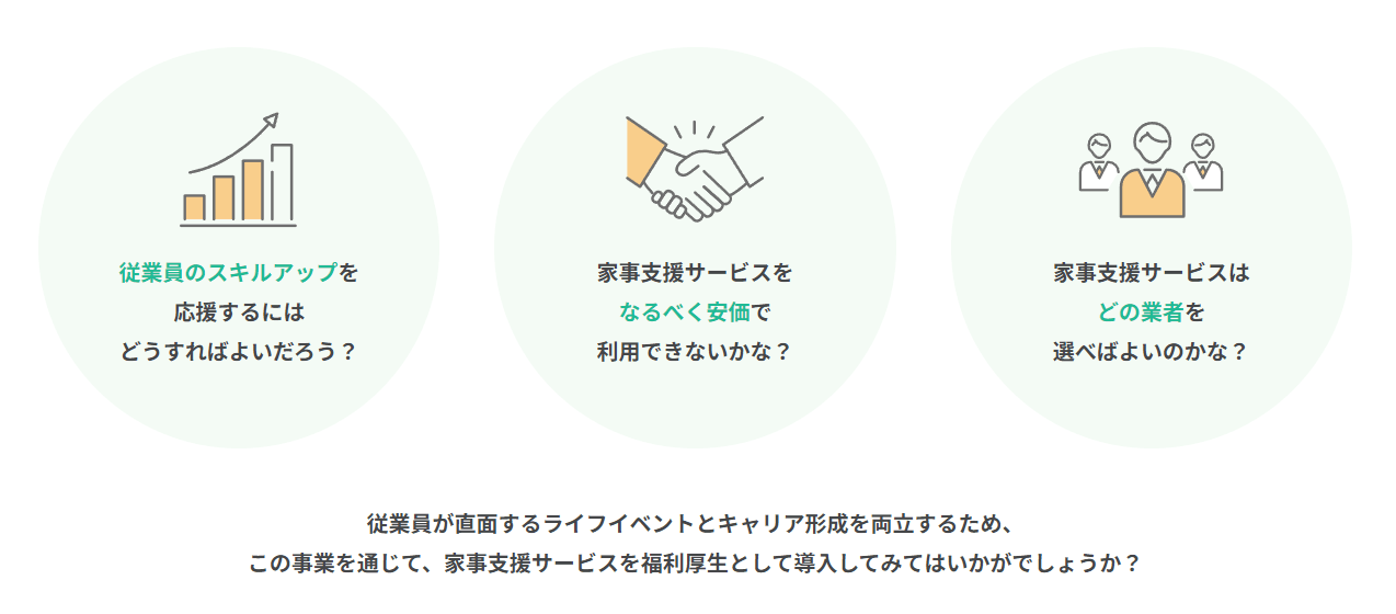 本事業は、働き手に福利厚生として家事支援サービスを広く利用していただくことにより、家事負担を軽減し、多様な人材が企業等で活躍できる環境整備を行うことを目指しています。
