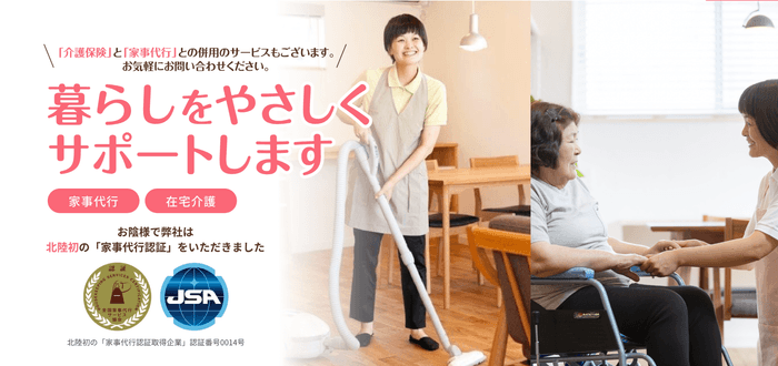 当社は、富山県を拠点に家事代行サービス、訪問介護サービスなどを提供しています。業績が認められ、北陸初の家事代行認証をいただきました。(「家事代行認証取得企業」認証番号0014号)