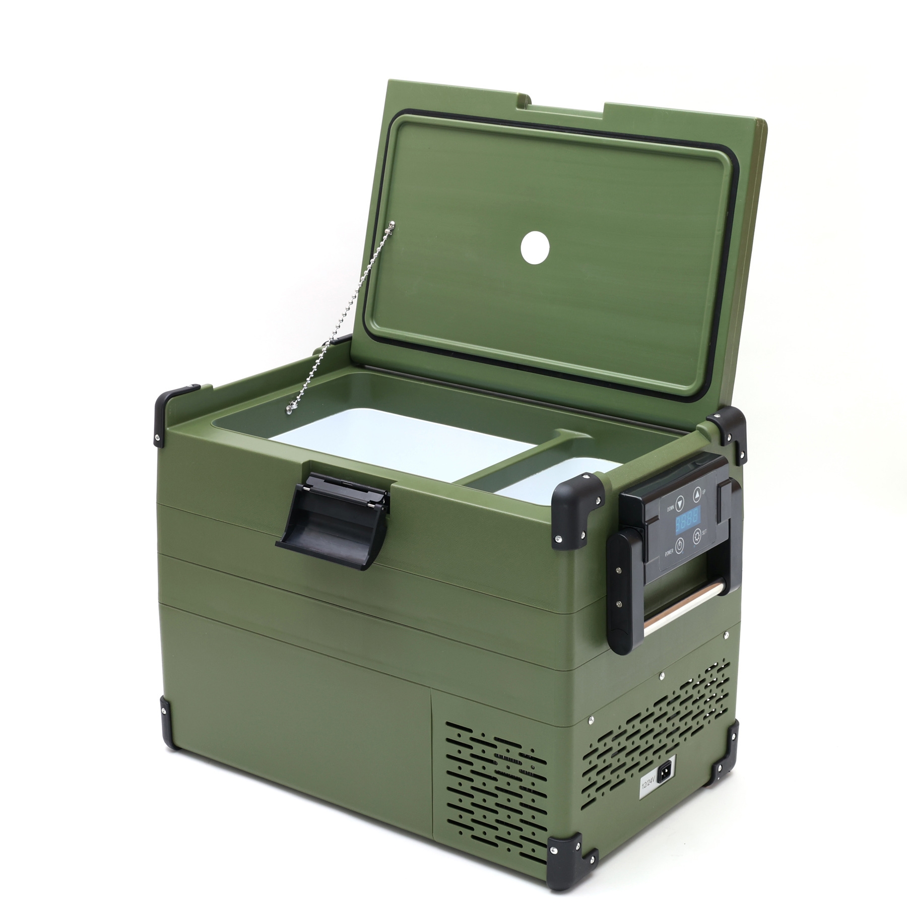 「RLC-CF40」は大容量40L分収納ができます。庫内は(大)32L・(小)8Lに分かれており、(大)は-20℃~10℃まで1℃単位で温度設定が可能。(大)は冷凍、(小)は冷蔵として同時に使用することが可能。AC/DC電源対応で車のシガープラグや、家庭用コンセントで使用できます。