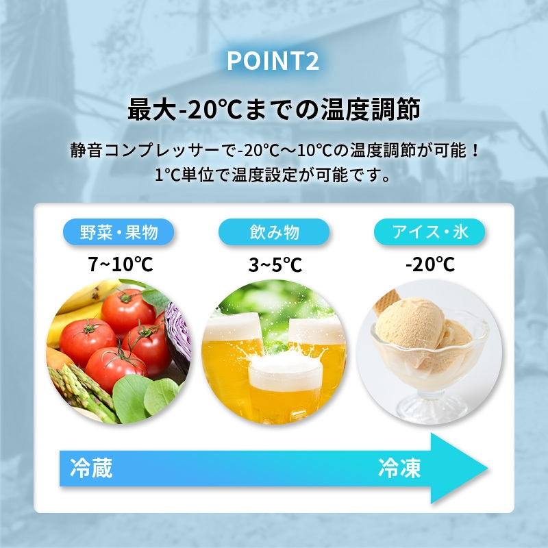 庫内(大)は32L・庫内(小)は8L収納可能。大は冷凍・冷蔵ができ-20℃~10℃まで温度設定ができます。小は冷蔵のみでき凍らせたくない物を収納できます。温度設定は1℃単位で設定可能、用途に合わせて様々なシーンで使えます。