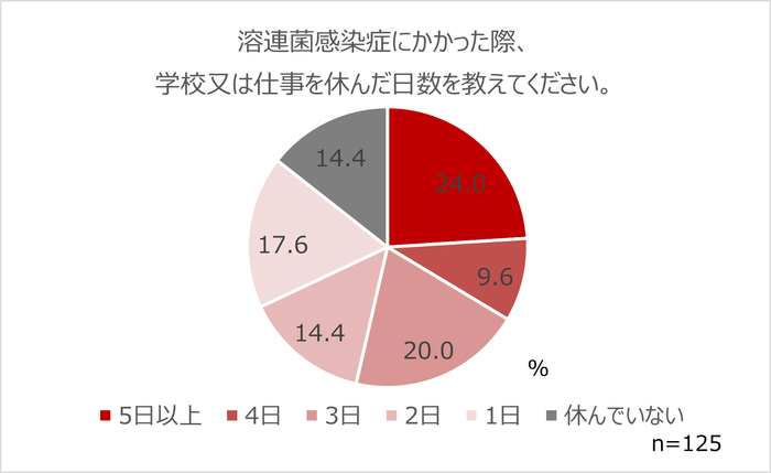 さらに、学校又は仕事に通っている方のうち、約4人に1人(24.0%)が、溶連菌感染症にかかった際に5日以上学校又は仕事を休んでいることが分かり、この結果からも溶連菌感染症の症状のつらさが伺えます。