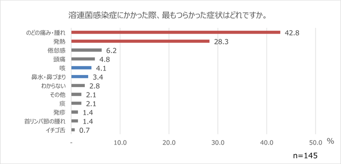 実際にどのような症状がつらかったのか調査した結果、「のどの痛み・腫れ」と「発熱」が圧倒的に多く、一般的な風邪症状に含まれる「咳」や「鼻水・鼻づまり」と回答した方は少ないことが分かりました。のどの痛みや発熱はあるけれど、咳や鼻水・鼻づまりはないという方は、注意が必要です。