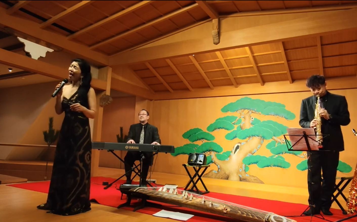 この特別な夜のために、ピアノ、サックス、箏の三重奏にボーカルを加えたアレンジが施され、舞妓さんがその調べに合わせてしなやかに舞います。
